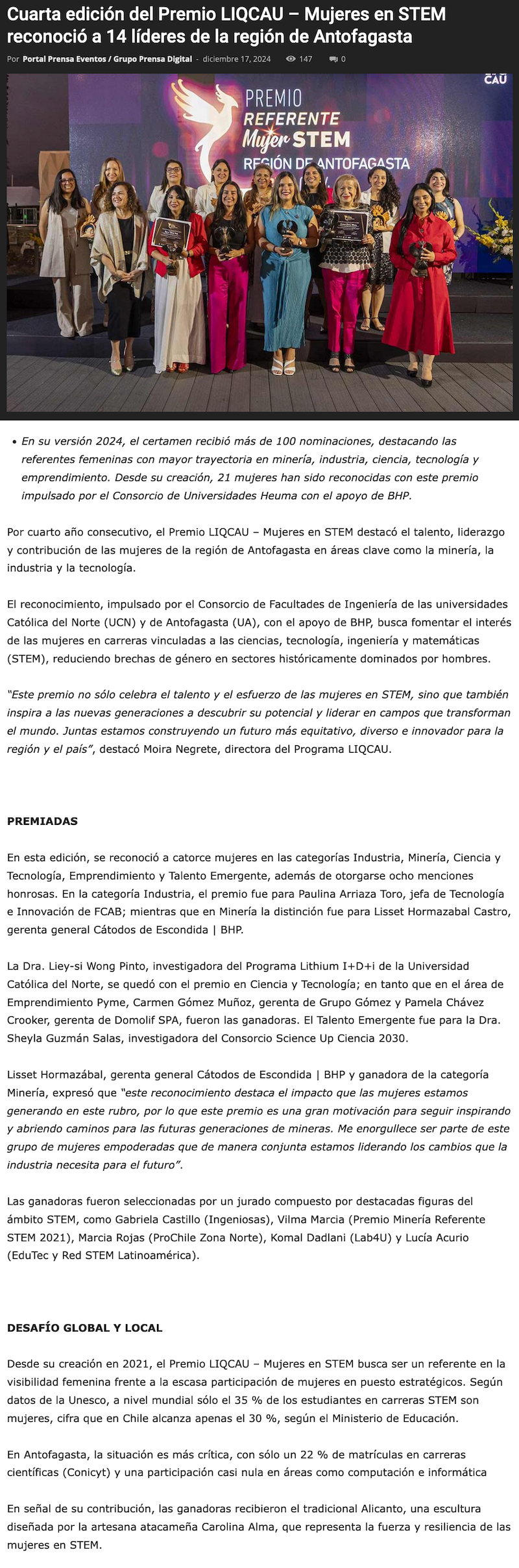 Cuarta edición del Premio LIQCAU – Mujeres en STEM reconoció a 14 líderes de la región de Antofagasta - (portalinnova.cl)