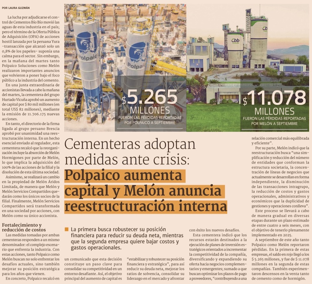 Cementera de Hurtado Vicuña tras capitalización: “Fortalece pensando en que habrá una recuperación” - (El Mercurio de Santiago)