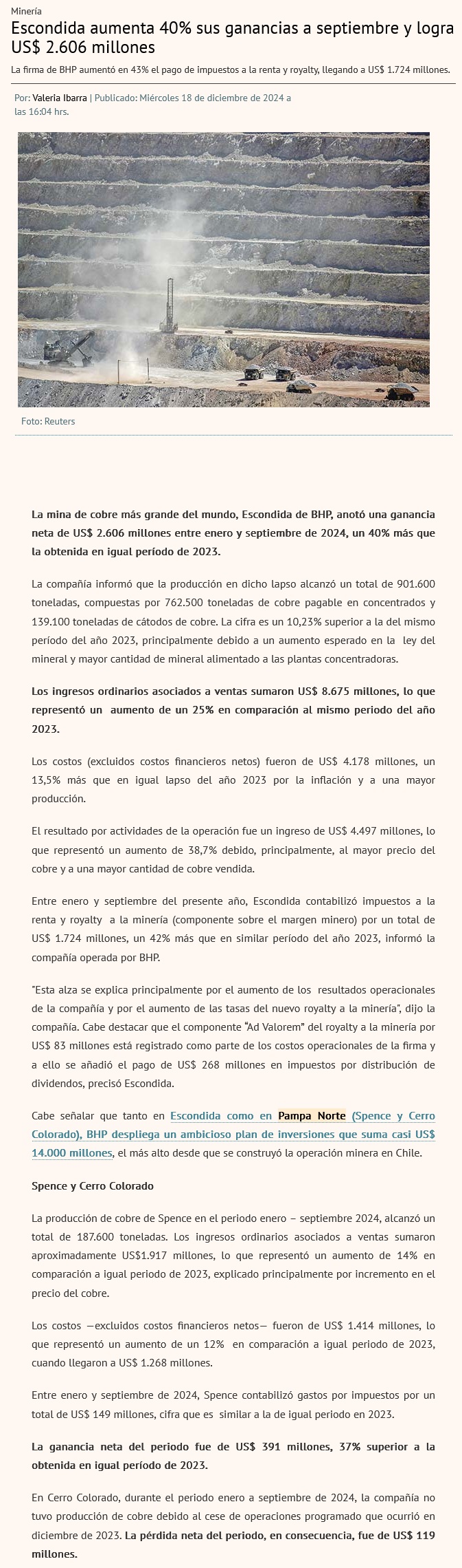 Por alza en ventas: Escondida | BHP aumentó sus ingresos en 38,7% durante periodo enero-septiembre 2024 - (soyantofagasta)