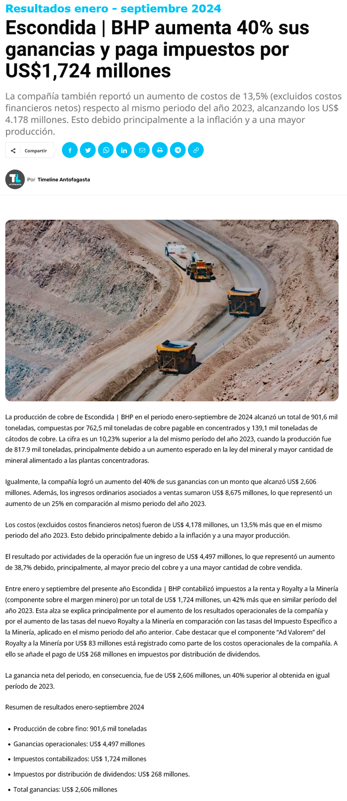 Por alza en ventas: Escondida | BHP aumentó sus ingresos en 38,7% durante periodo enero-septiembre 2024 - (soyantofagasta)