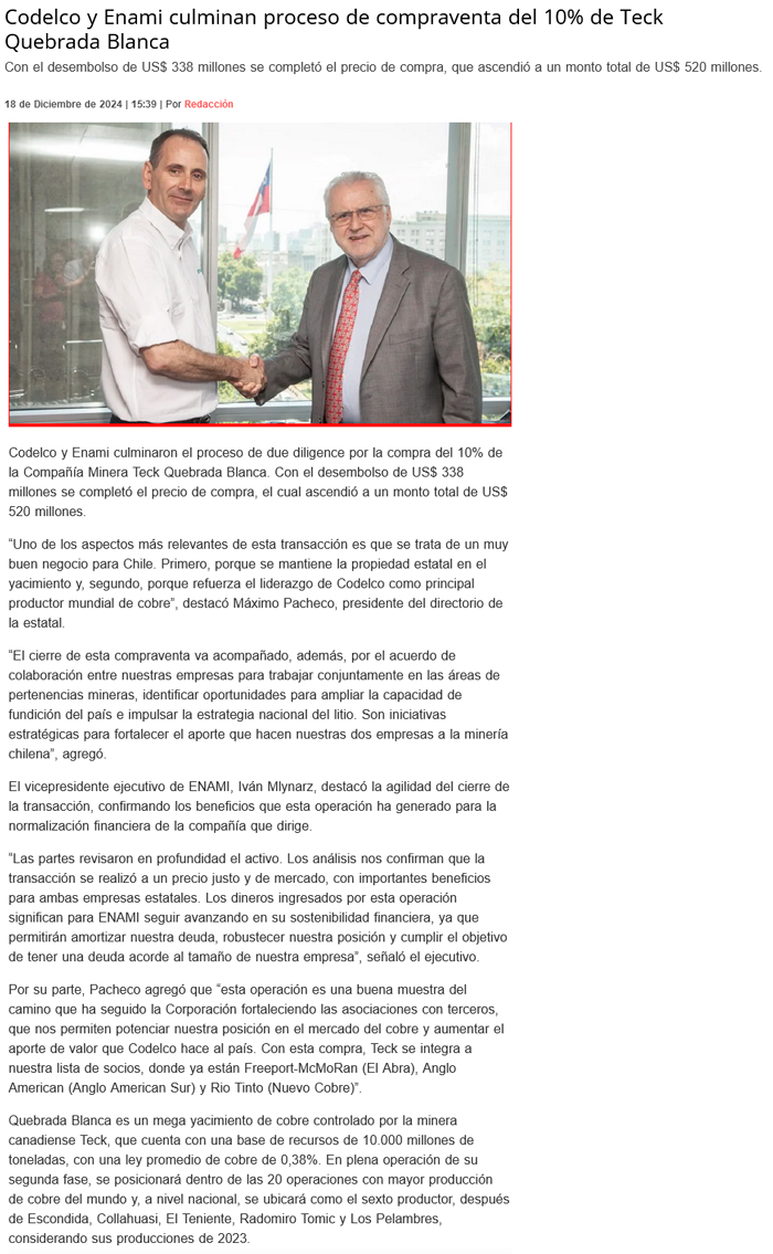 Codelco y Enami culminan proceso de compraventa del 10% de la Compañía Minera Teck Quebrada Blanca - (nuevaminería online)