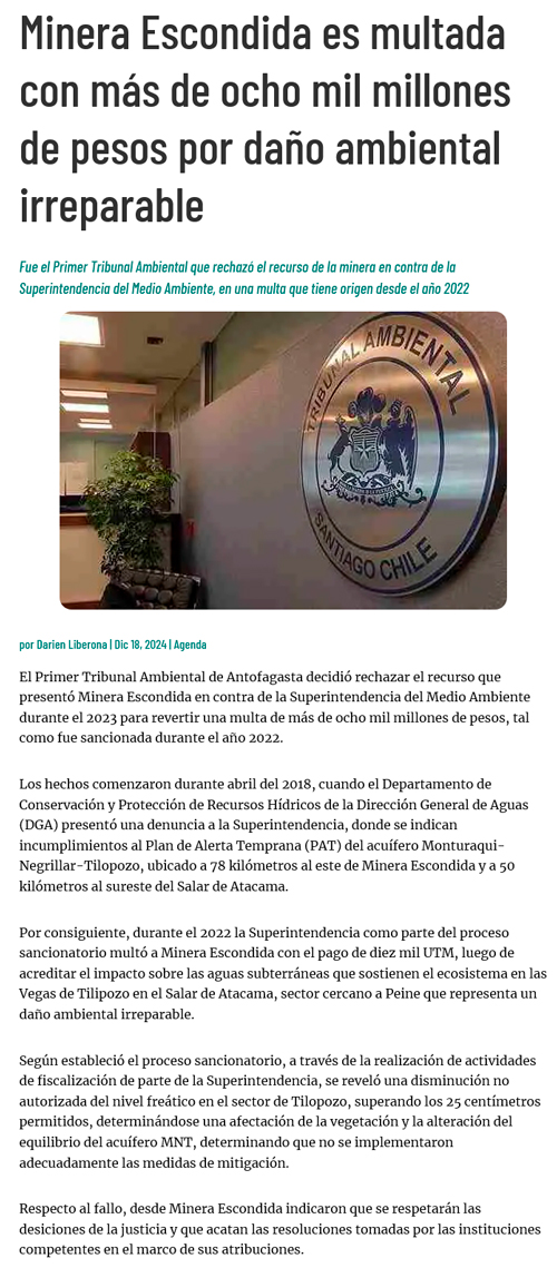 Rechazan reclamación de Escondida y confirman histórica multa por daño ambiental irreparable - (terram.cl)