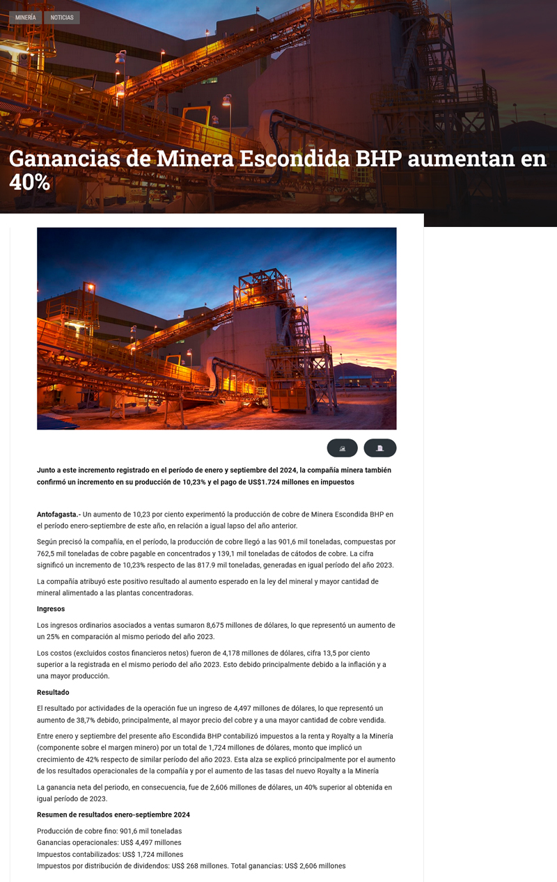 Por alza en ventas: Escondida | BHP aumentó sus ingresos en 38,7% durante periodo enero-septiembre 2024 - (soyantofagasta)