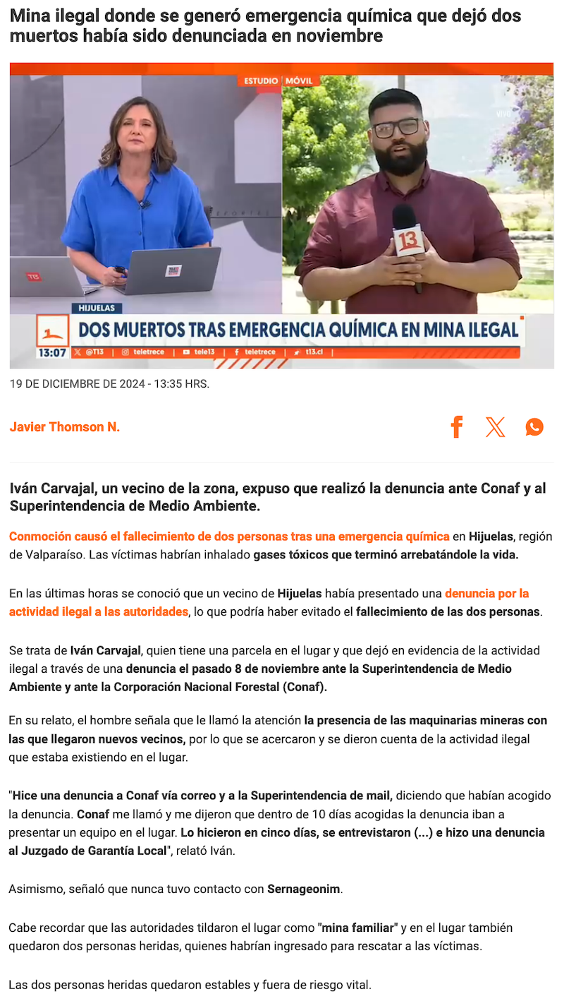 Dos trabajadores mueren intoxicados en faena irregular en una mina de Hijuelas - (El Mercurio de Valparaíso)