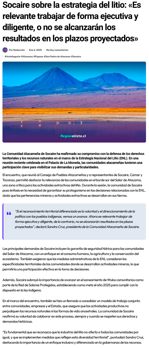 Estrategia Nacional del Litio: Socaire pide mayor injerencia en la discusión - (El Mercurio de Antofagasta)