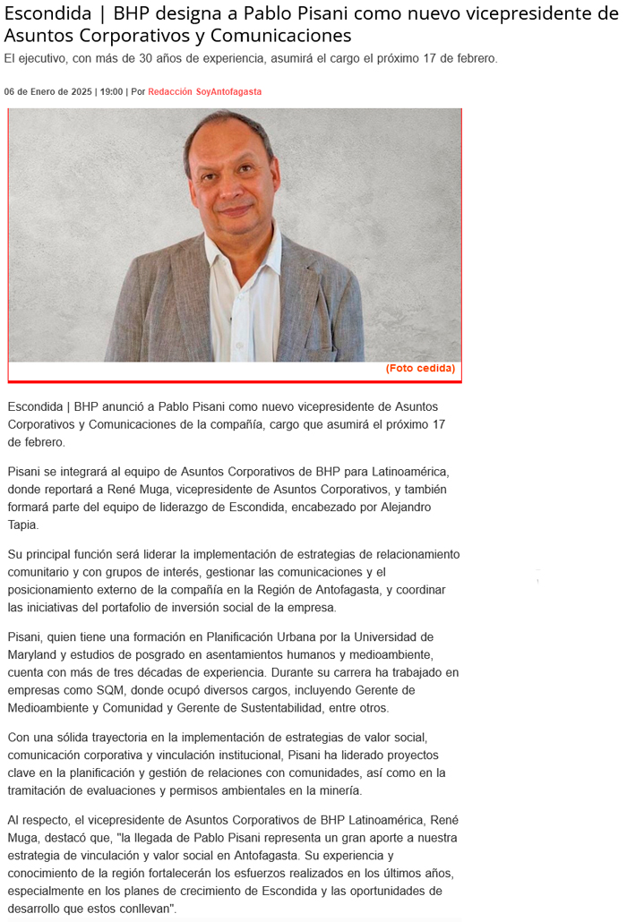 Escondida | BHP confirma a Pablo Pisani como nuevo vicepresidente de Asuntos Corporativos y Comunicaciones - (timeline)