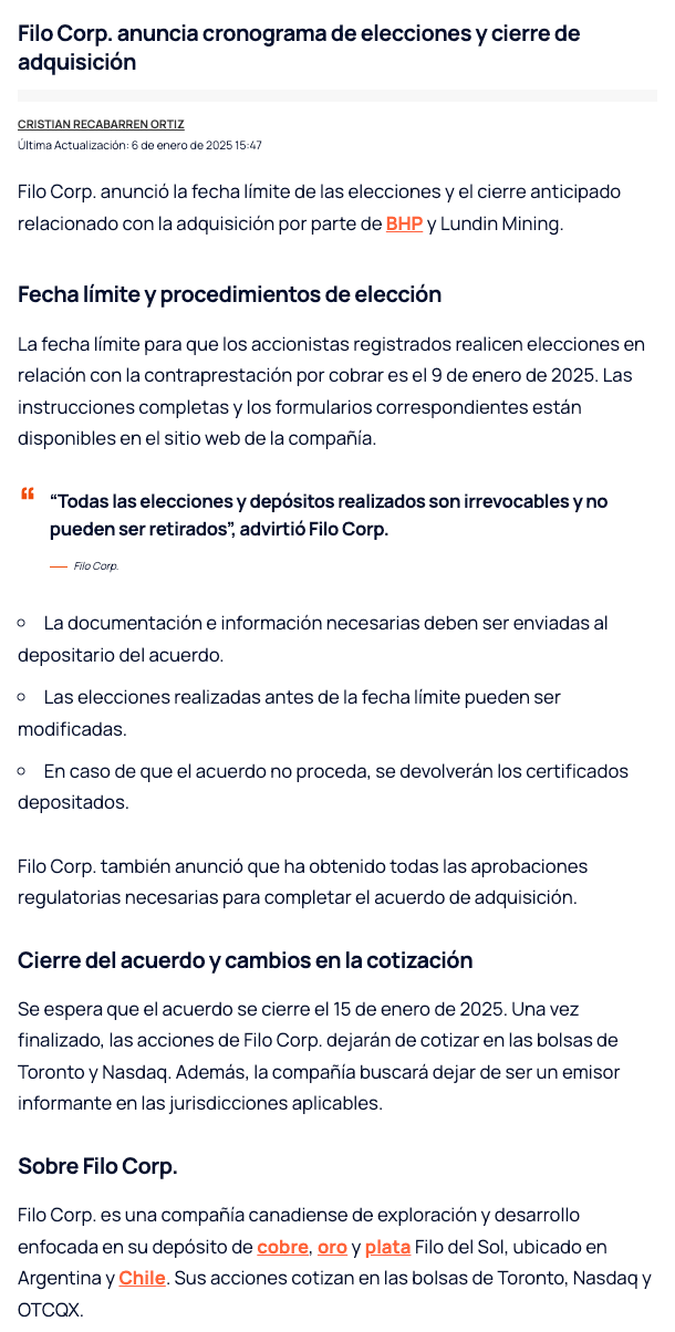 ¡Hay fecha! BHP y Lundin Mining cerrarán el acuerdo la próxima semana para adquirir Filo - (reporteminero)