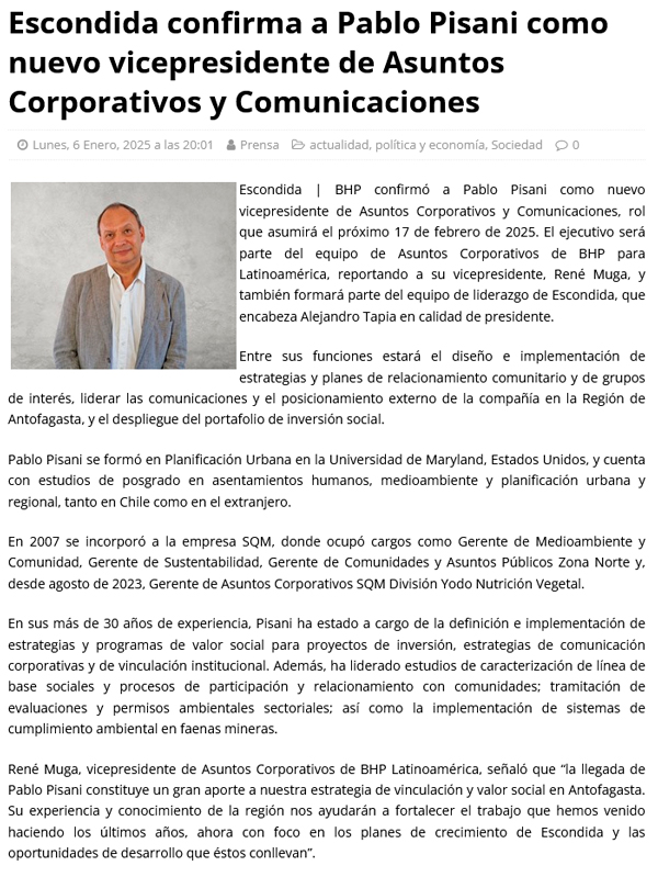 Escondida confirma a Pablo Pisani como nuevo vicepresidente de Asuntos Corporativos y Comunicaciones - (regionesnoticias.cl)