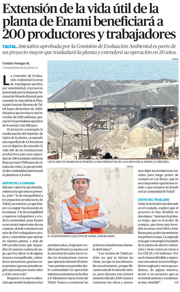 Comisión de Evaluación Ambiental aprueba extensión de vida útil de planta de Enami en Taltal hasta 2029 - (Diario Financiero)