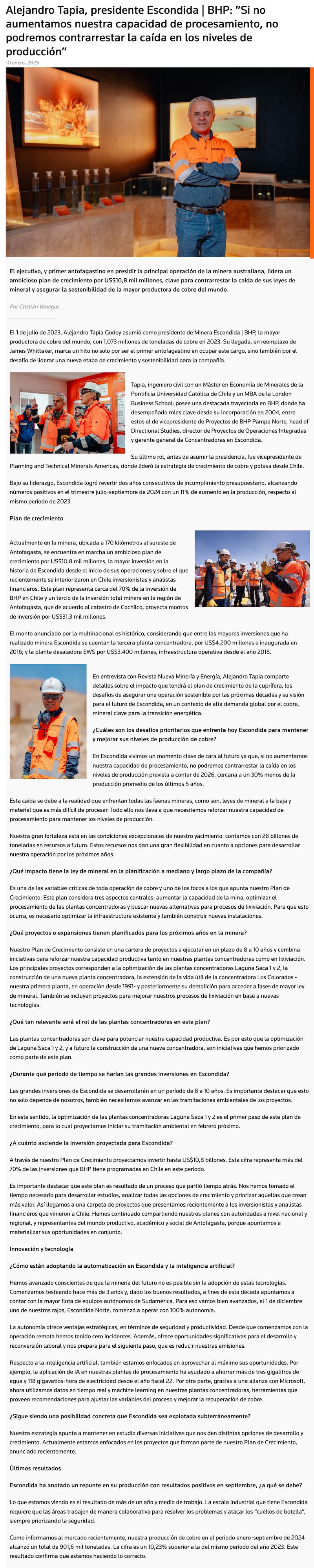 Alejandro Tapia Godoy lidera histórica inversión de US$10.8 mil millones en Minera Escondida para impulsar sostenibilidad y crecimiento en la producción de cobre - (redimin)