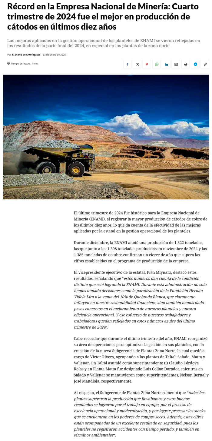 Estatal Enami logra récord en producción de cátodos de cobre - (Pulso)