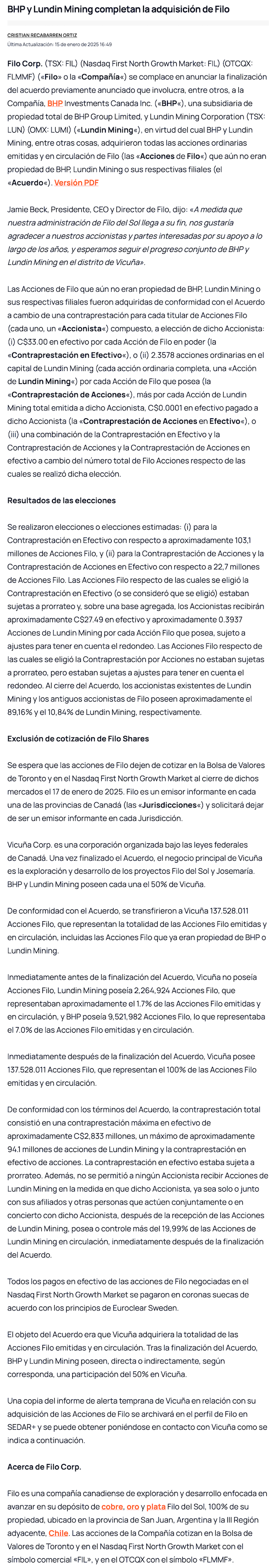 BHP y Lundin completan la adquisición de Filo Corp - (rumbominero.com (Perú))