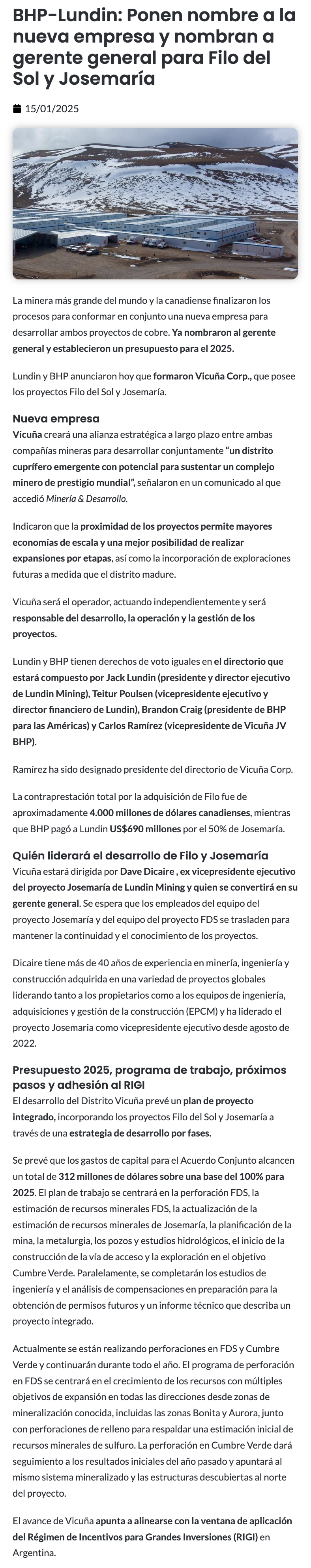 Lundin Mining completa adquisición conjunta de Filo con BHP y venta del 50% de Josemaria para formar Vicuña Corp. - (redimin)
