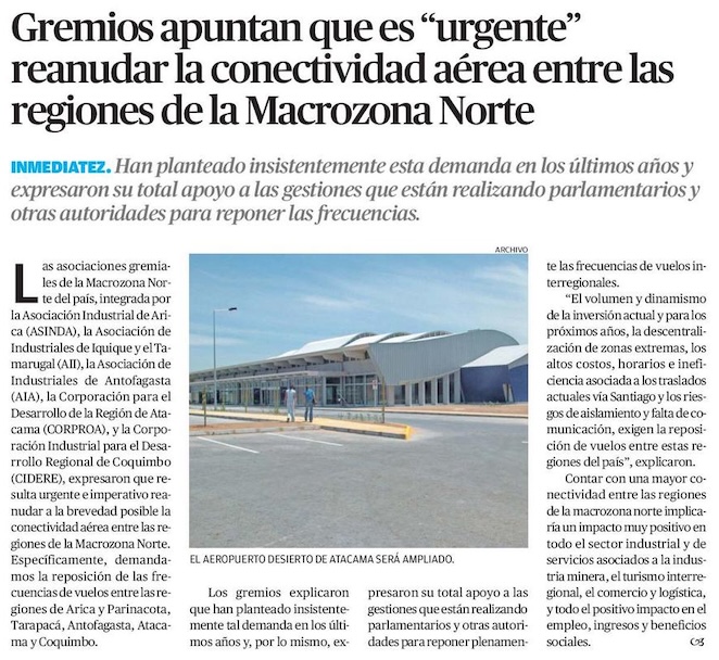 Gremios industriales de macrozona norte piden restitución de vuelos interregionales - (El Mercurio de Antofagasta)