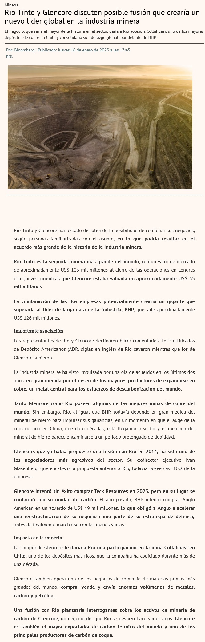 Rio Tinto y Glencore discuten una posible fusión: sería el mayor acuerdo minero de la historia - (bloomberglinea.com)