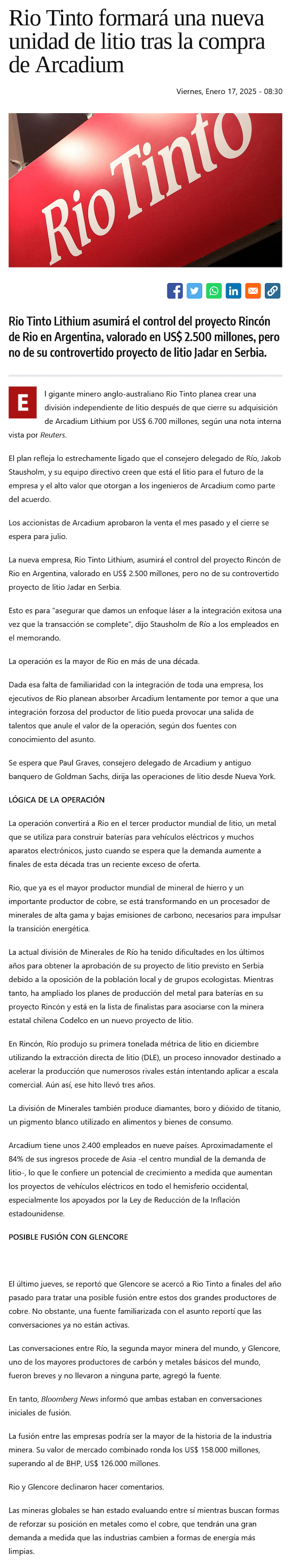 Potencial Mega Fusión en Minería: Rio Tinto y Glencore Exploran Crear el Gigante Global Más Grande del Sector - (redimin)