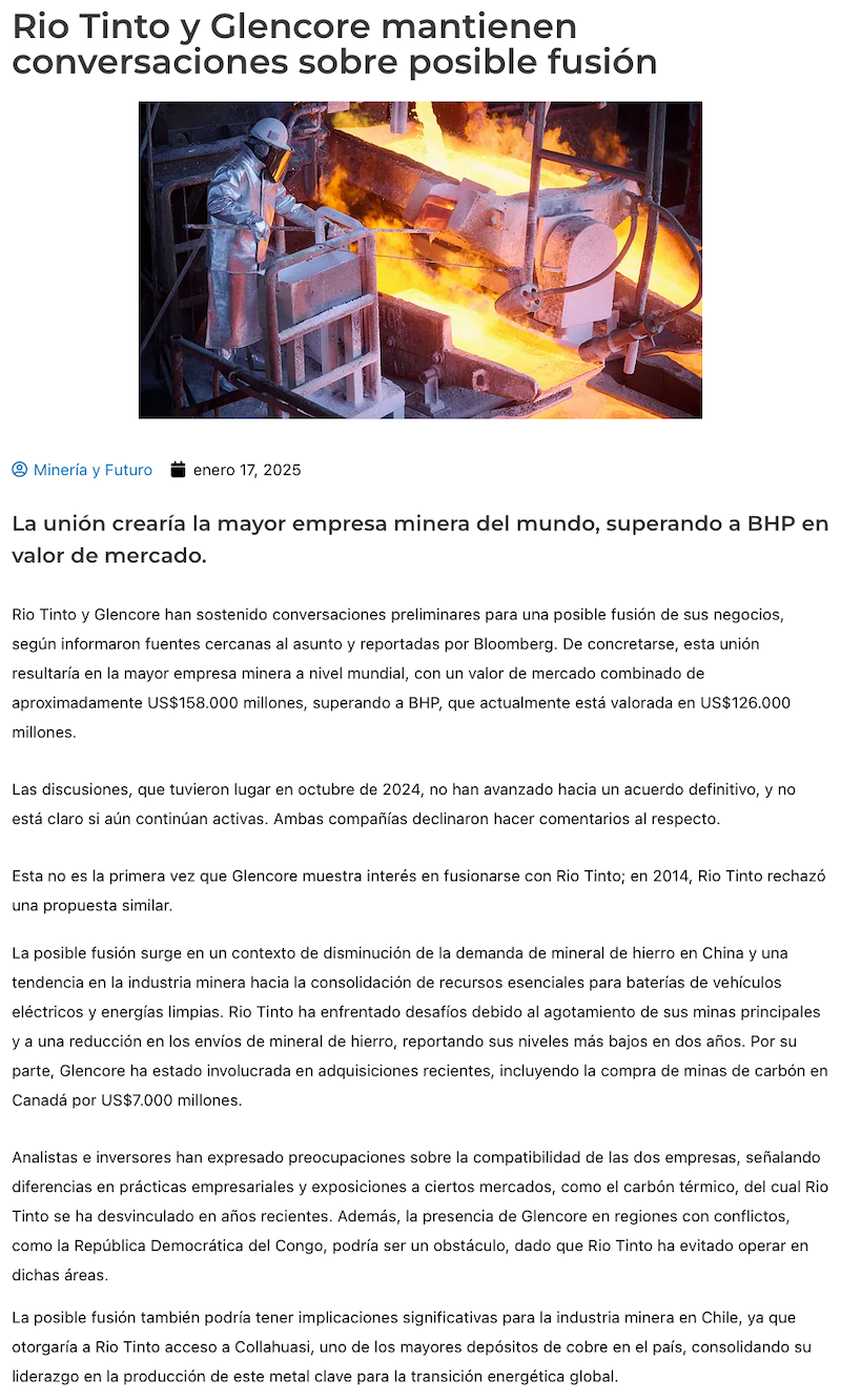 Gigante minero mundial emergerá tras posible fusión Rio Tinto-Glencore con fuerte presencia en el norte de Chile - (poderyliderazgo)