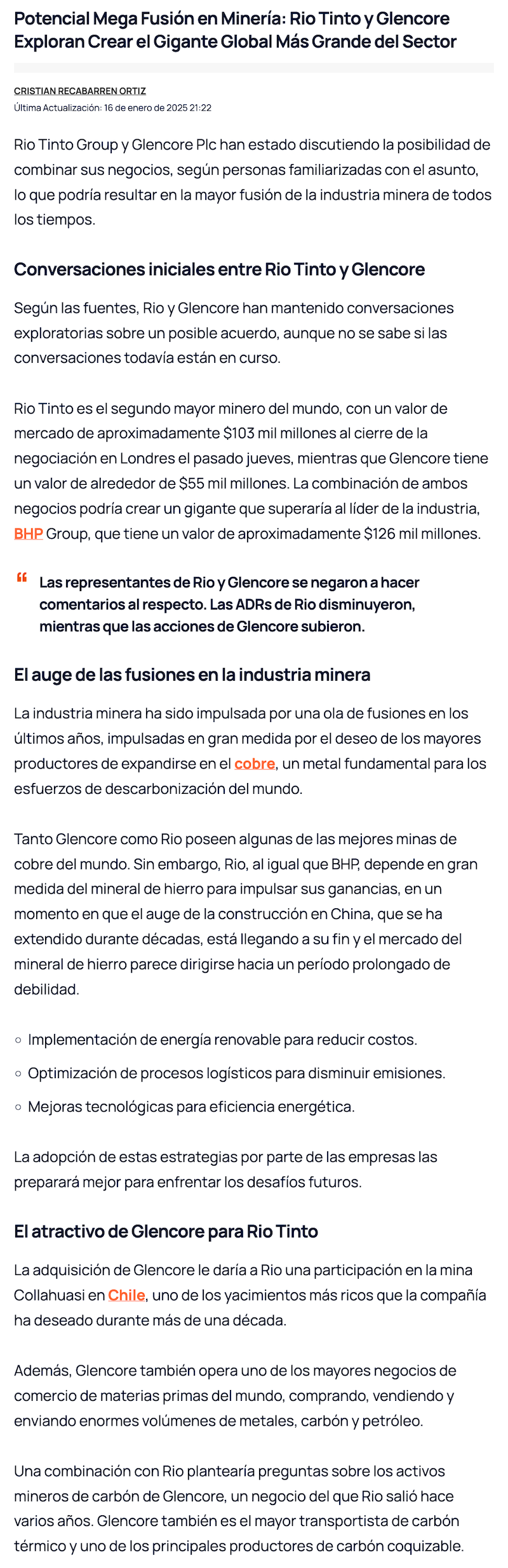 Rio Tinto y Glencore mantienen conversaciones sobre posible fusión - (mineriayfuturo.cl)