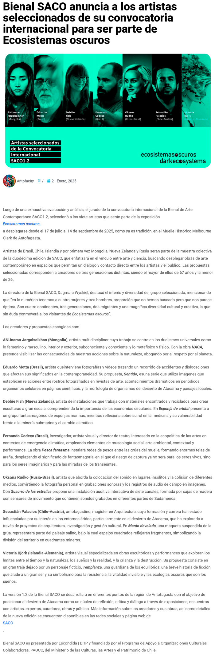 Bienal SACO anuncia a los artistas seleccionados de su convocatoria internacional para ser parte de Ecosistemas oscuros - (diarioangamos)