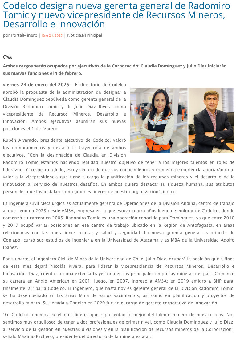 Codelco designa nueva gerenta general de Radomiro Tomic y nuevo VP de recursos mineros, desarrollo e innovación - (reporteminero)