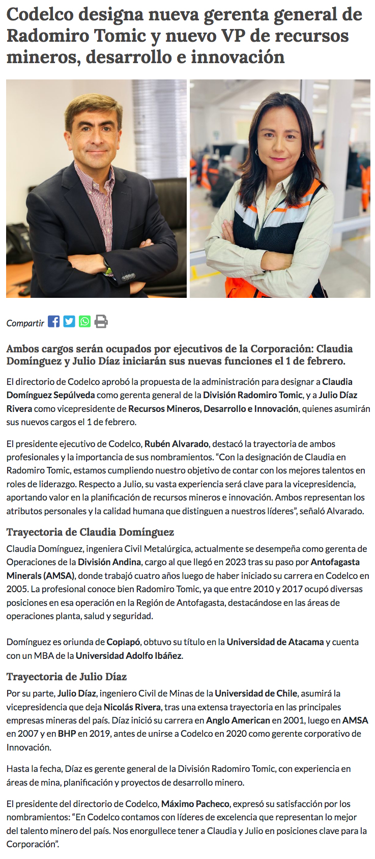 Codelco designa nueva gerenta general de Radomiro Tomic y nuevo vicepresidente de Recursos Mineros, Desarrollo e Innovación - (portalminero)