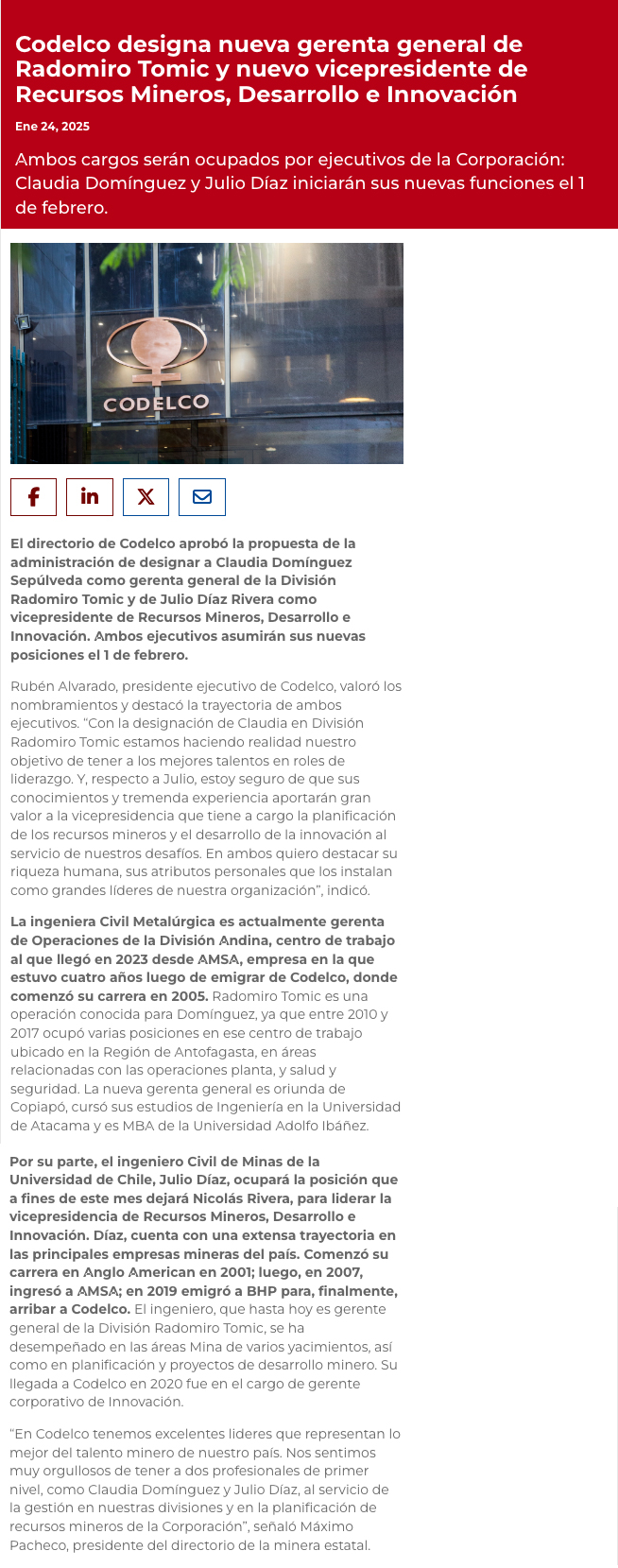 Codelco designó a la nueva gerenta general de Radomiro Tomic y nuevo vicepresidente de recursos mineros - (madero.cl)