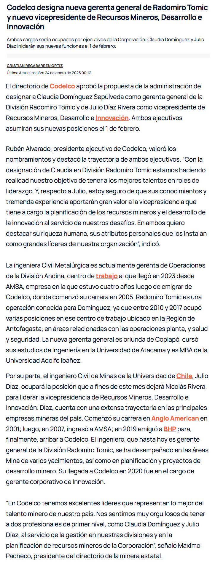 Codelco designa nueva gerenta general de Radomiro Tomic y nuevo vicepresidente de Recursos Mineros, Desarrollo e Innovación - (mch.cl)