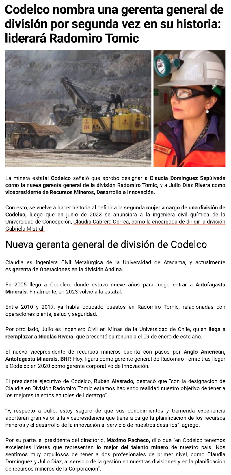 Codelco designa nueva gerenta general de Radomiro Tomic y nuevo vicepresidente de Recursos Mineros, Desarrollo e Innovación - (mch.cl)