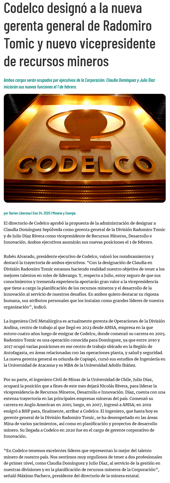 Codelco designa nueva gerenta general de Radomiro Tomic y nuevo vicepresidente de Recursos Mineros, Desarrollo e Innovación - (redimin)