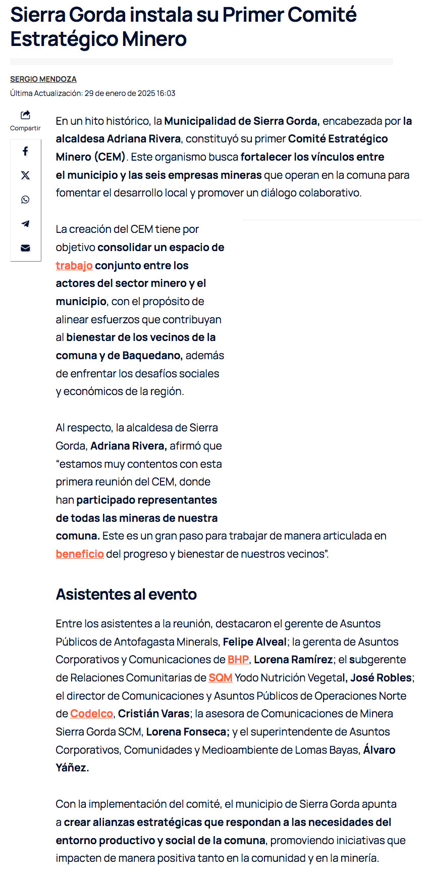 Sierra Gorda crea su primer Comité Estratégico Minero para fomentar el desarrollo local - (elreferente.cl)