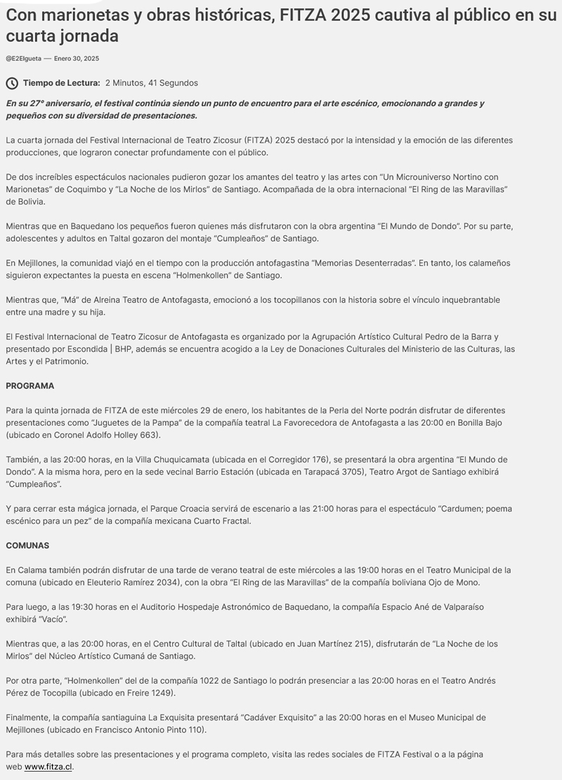 Con marionetas y obras históricas, FITZA 2025 cautiva al público en su cuarta jornada - (calamaenlinea.cl)