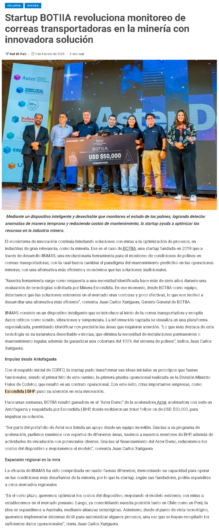 Startup BOTIIA revoluciona monitoreo de correas transportadoras en la minería con innovadora solución - (redimin)
