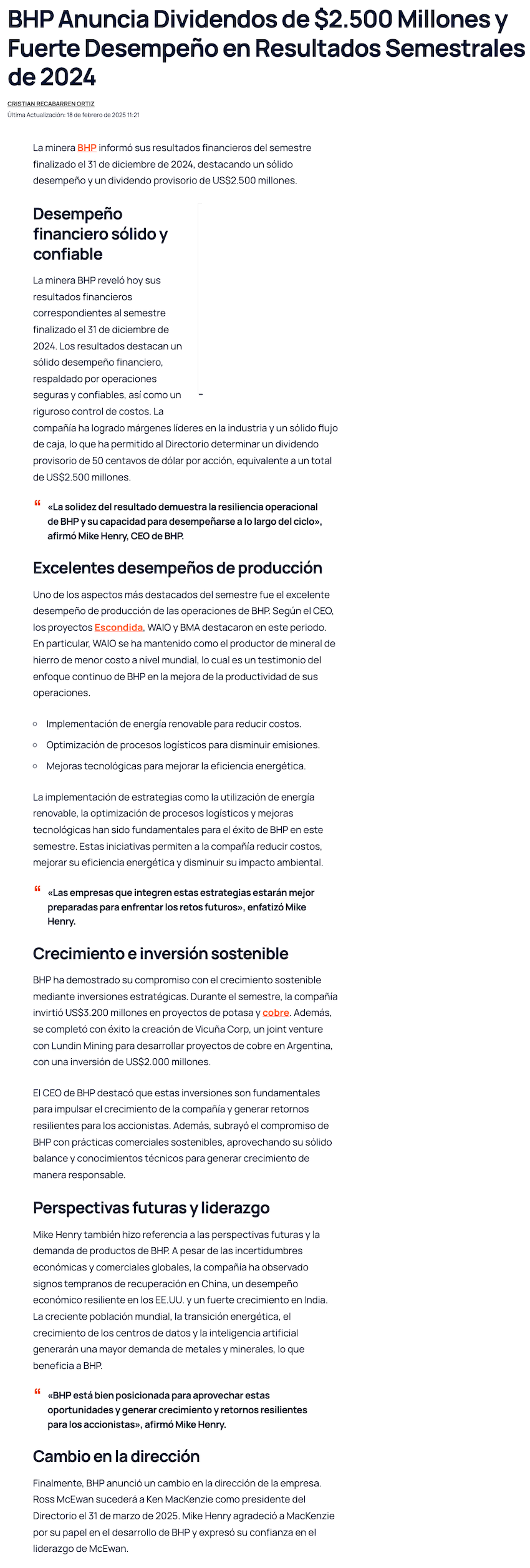 BHP actualiza sus resultados financieros y destaca comportamiento productivo de Escondida - (mch.cl)