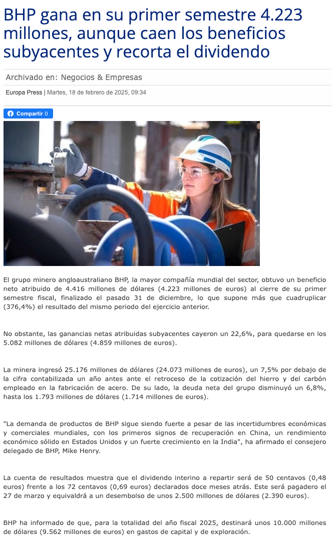 BHP Anuncia Dividendos de $2.500 Millones y Fuerte Desempeño en Resultados Semestrales de 2024 - (redimin)