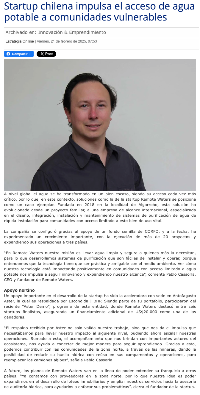 Startup chilena impulsa el acceso de agua potable a comunidades vulnerables - (eldiariosantiago.cl)