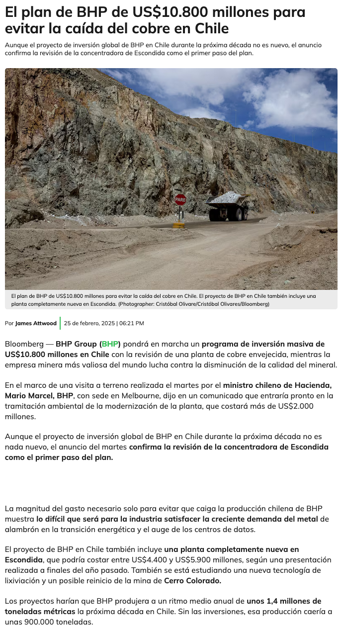 BHP da el vamos a plan de crecimiento en Chile: ingresará proyecto por más de US$ 2.000 millones para optimizar concentradora de Escondida - (La Tercera Online)