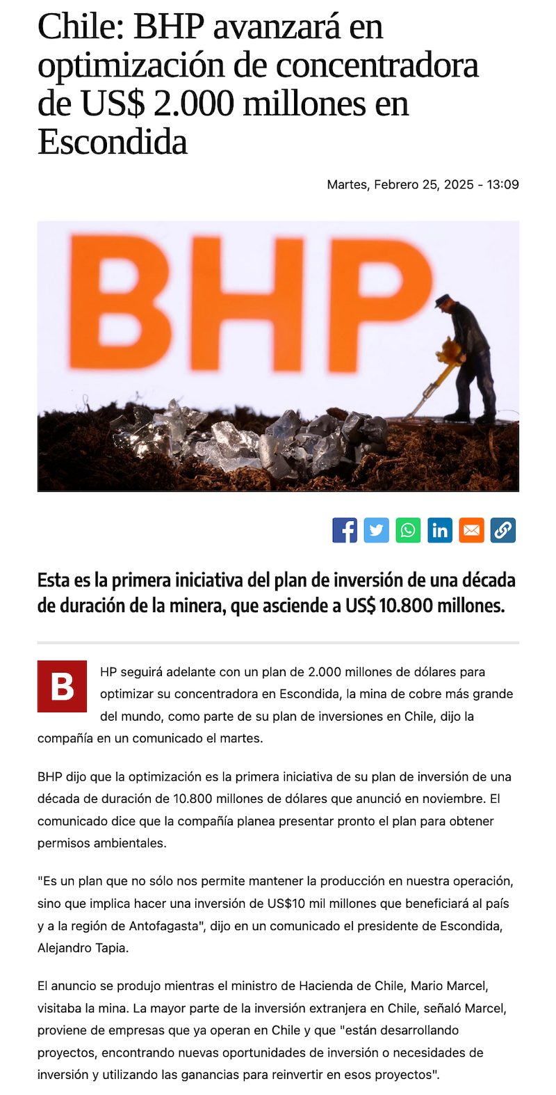 BHP inicia plan de inversión de más de US$10 mil millones en Chile con optimización de Escondida - (redimin)