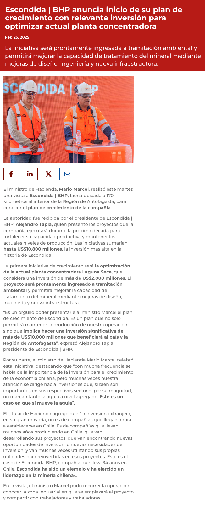 Escondida | BHP anuncia el inicio de su plan de crecimiento con inversión de más de US$ 2.000 millones para optimizar actual planta concentradora - (mvcomunicaciones.cl)