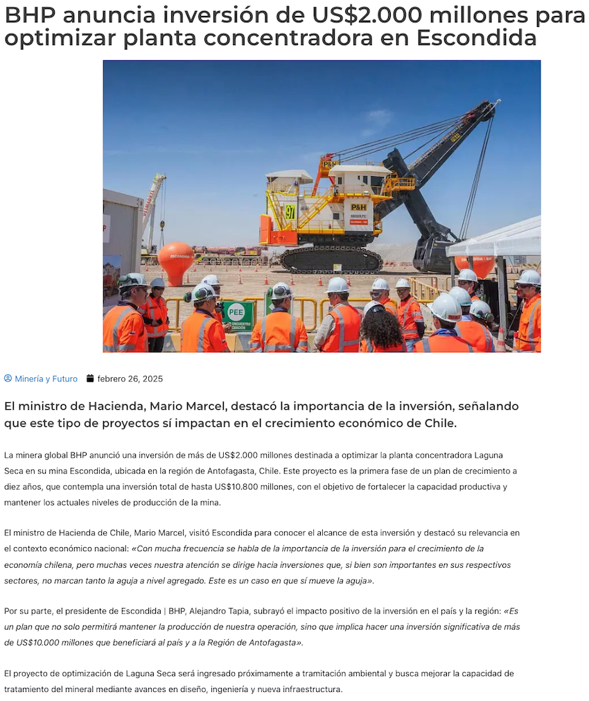 BHP anuncia inicio de su plan de crecimiento con inversión de más de US$ 2.000 millones para optimizar actual planta concentradora - (elperiodista.cl)