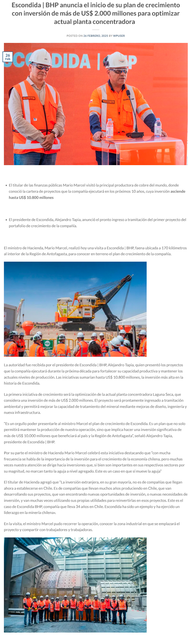 Escondida | BHP anuncia inicio de su plan de crecimiento con relevante inversión para optimizar actual planta concentradora - (mch.cl)