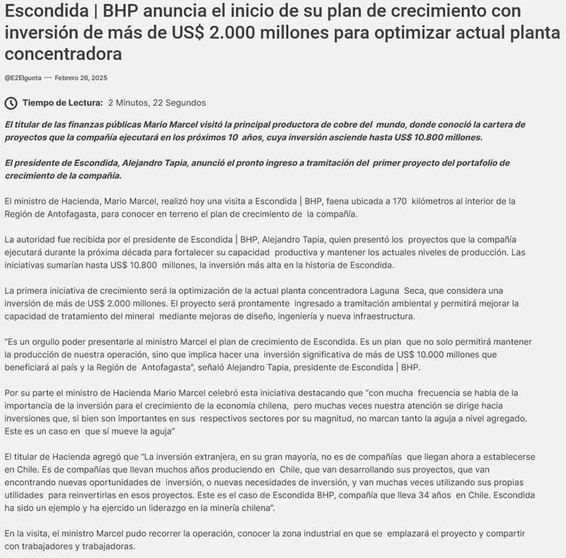 Escondida | BHP anuncia inicio de su plan de crecimiento con relevante inversión para optimizar actual planta concentradora - (mch.cl)