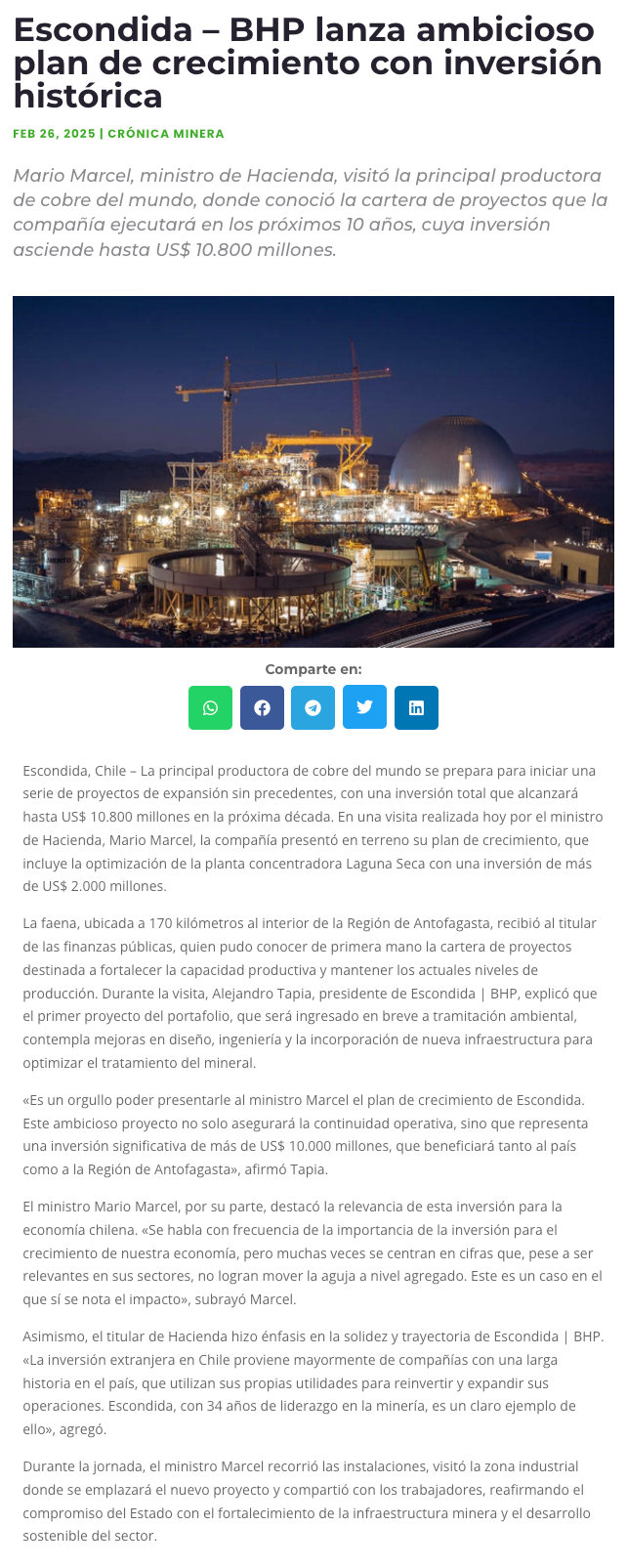 Escondida | BHP anuncia inicio de su plan de crecimiento con relevante inversión para optimizar actual planta concentradora - (mch.cl)
