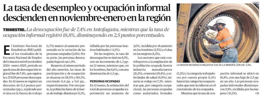 El desempleo bajó un 0,4% y alcanzó su menor nivel desde 2023 - (El Mercurio de Antofagasta)