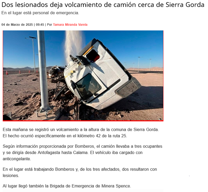 Camión volcó en Sierra Gorda: Dos lesionados y litros de anticongelantes vertidos en el desierto - (antofagastaaldia.cl)