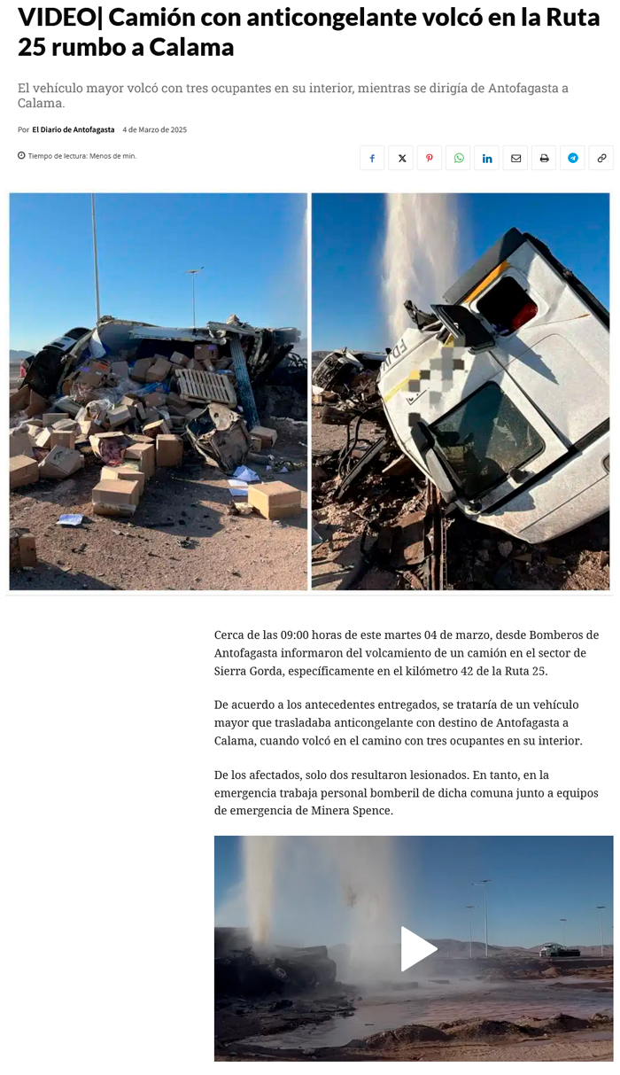 Camión volcó en Sierra Gorda: Dos lesionados y litros de anticongelantes vertidos en el desierto - (antofagastaaldia.cl)