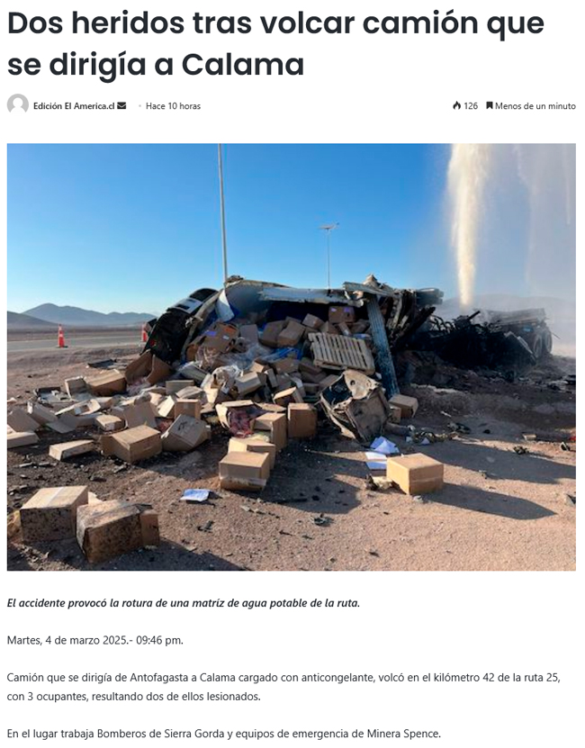 Accidente en la ruta Sierra Gorda deja dos heridos y afecta suministro de agua potable - (elreferente.cl)