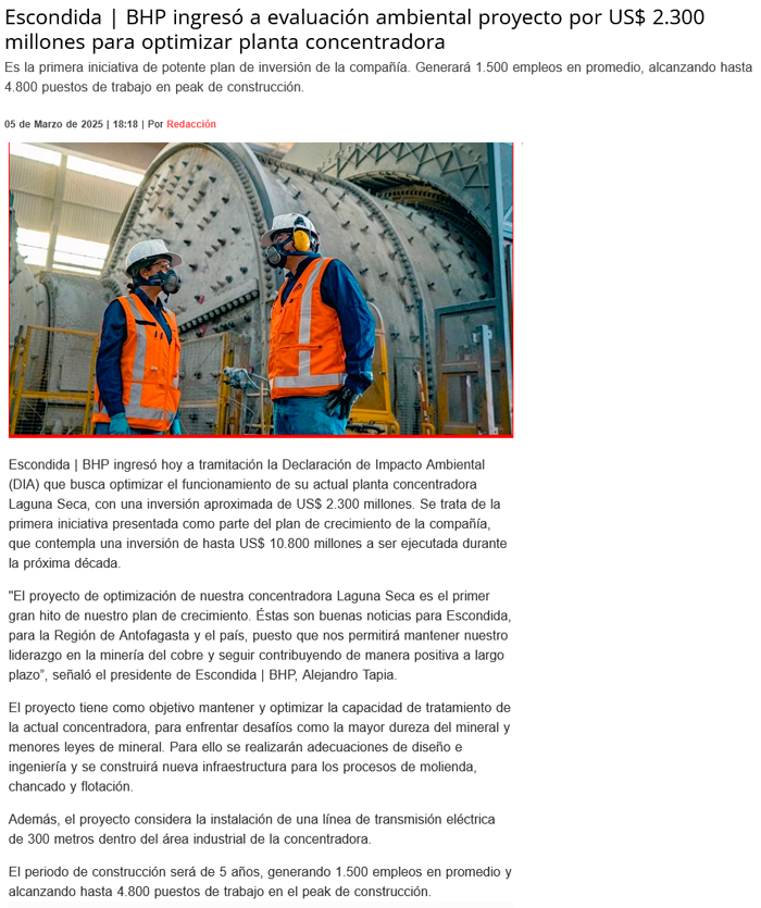 Escondida ingresa DIA para primer proyecto de inversión por US$ 2.300 millones: optimizará su planta concentradora - (timeline)