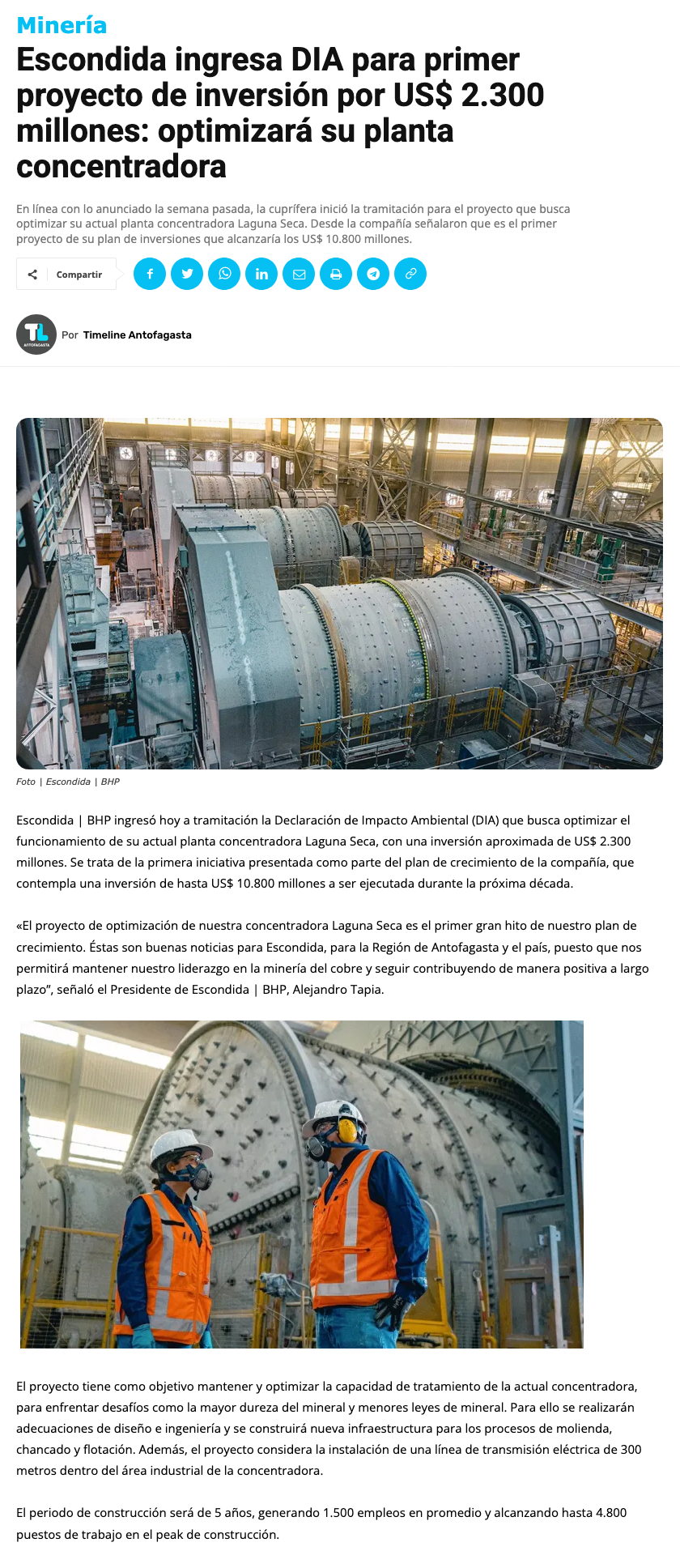 Escondida ingresa DIA para primer primer proyecto de inversión por US$ 2.300 millones: optimizará su planta concentradora - (timeline)
