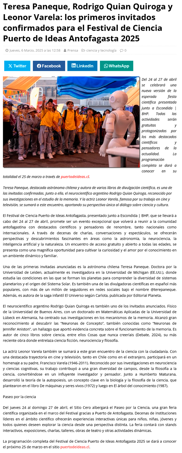 Teresa Paneque, Rodrigo Quian Quiroga y Leonor Varela: los primeros invitados confirmados para el Festival de Ciencia Puerto de Ideas Antofagasta 2025 - (cpcomunicaciones.cl)