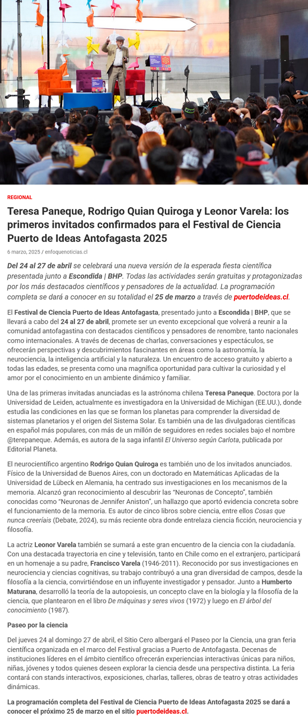 Teresa Paneque, Rodrigo Quian Quiroga y Leonor Varela: los primeros invitados confirmados para el Festival de Ciencia Puerto de Ideas Antofagasta 2025tico - (g5noticias.cl)